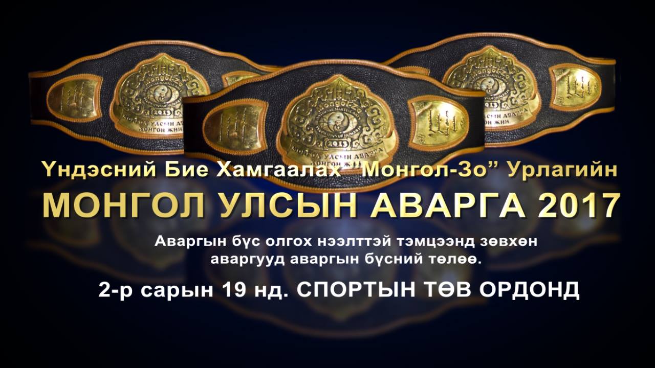 Монголын Үндэсний Бие Хамгаалах “Монгол-Зо” Урлагийн 2017 оны “Монгол Улсын Аварга” аваргын бүс олгох нээлттэй тэмцээн 2017 оны 02-р сарын 19-нд зохиогдох тул баг тамирчдаа бэлтгэн оролцуулахыг урьж байна.